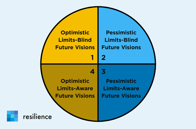 For the purposes of this article, I’ve divided fictional futures into four quadrants. The first quadrant describes optimistic limits-blind visions of the future. The second quadrant focuses on pessimistic limits-blind visions. The third quadrant describes limits-aware pessimistic possibilities, while the fourth quadrant focuses on optimistic limits-aware possibilities. Spoiler alert: only one quadrant is worthy of our serious, long-term attention and effort.